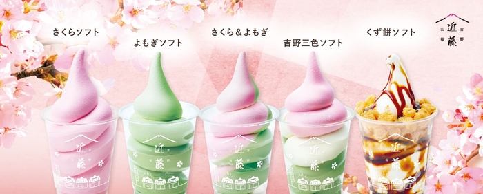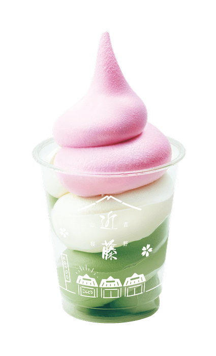 吉野三色ソフトは"さくら"、"若葉"、"雪景色"、"吉野山"の四季を感じられる風情あるソフトクリームです。