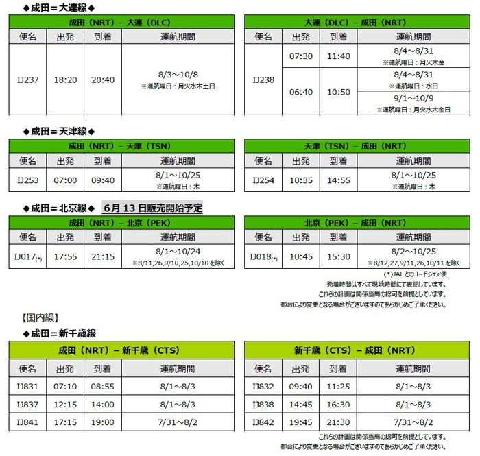 また、成田=北京線についても、6月13日に販売を予定しています。
