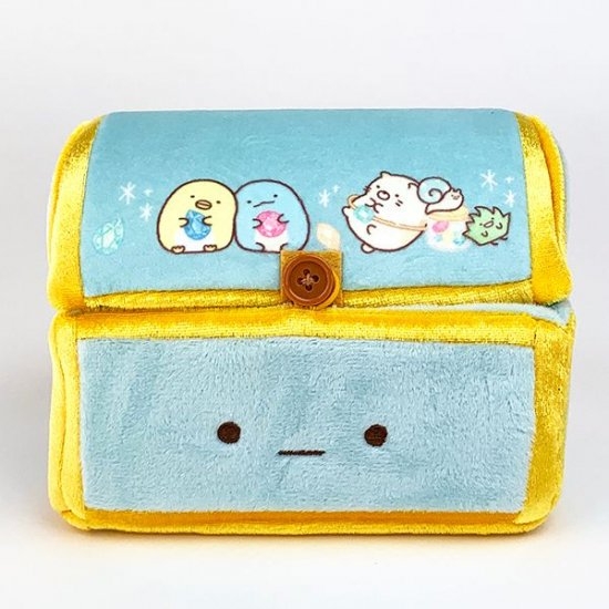 すみっコぐらしコレクションの、たからばこです。ソフトな素材でできたたからばこのぬいぐるみには、お顔もついていますね♪縁取りがキラキラしたゴールドで、中には何が入っているのでしょうか。