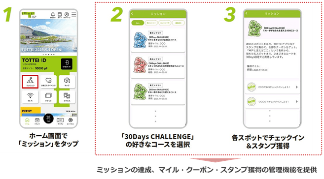 本サービスは、株式会社One Bright KOBEが2025年3月に配信開始した、TOTTEI※や神戸での体験をさらに充実させる「TOTTEI KOBE公式アプリ」に導入されており、ミッション、デジタルスタンプラリー、TOTTEIマイルなどの管理機能・データ管理を担っています。