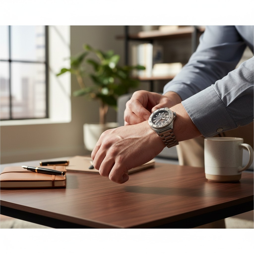 45mmのケースサイズは、腕元にしっかりとした存在感を与え、コーディネートの主役になるデザインです。スポーツウォッチらしい力強さを持ちながら、スーツにもカジュアルにも合わせやすい万能なスタイル性を実現しています。また、文字盤の視認性が高く、アウトドアシーンでも時間がひと目で確認できるため、見た目と実用性を兼ね備えたサイズ感となっています。