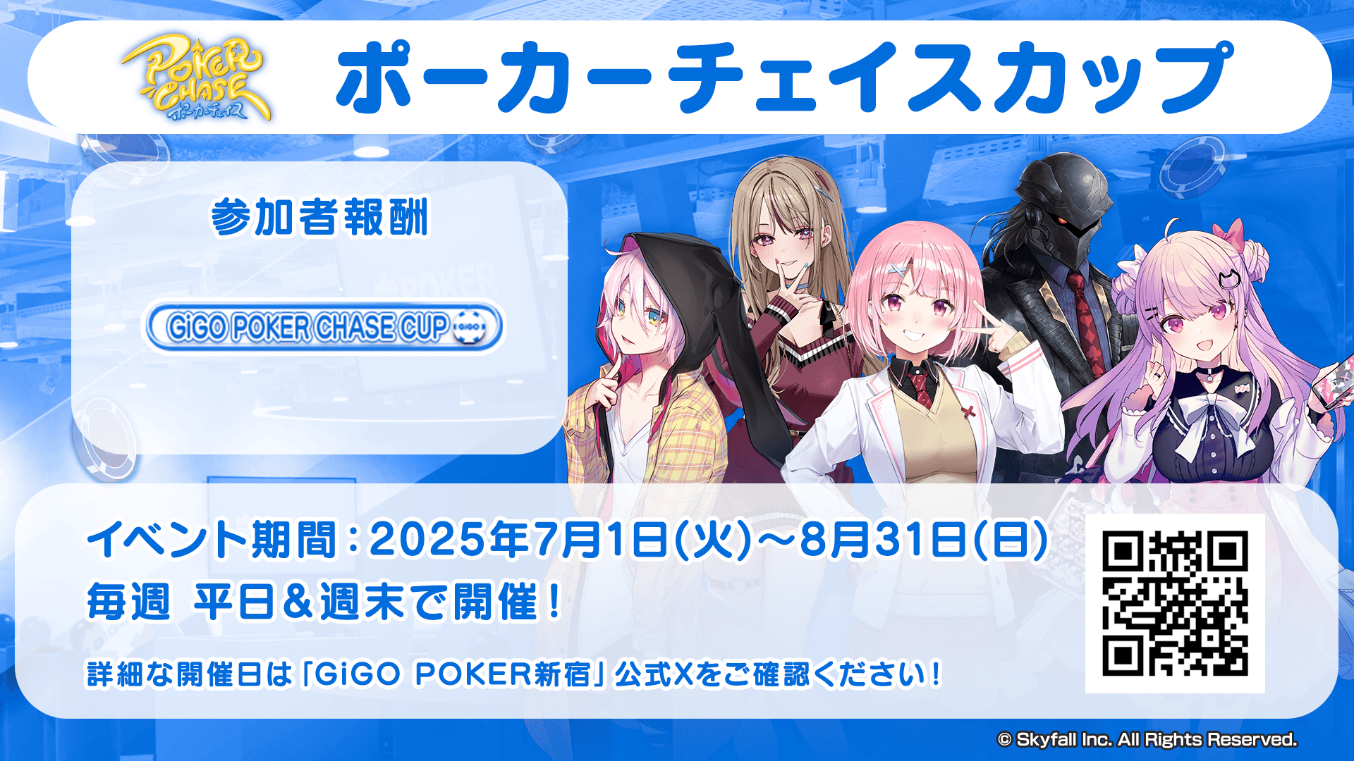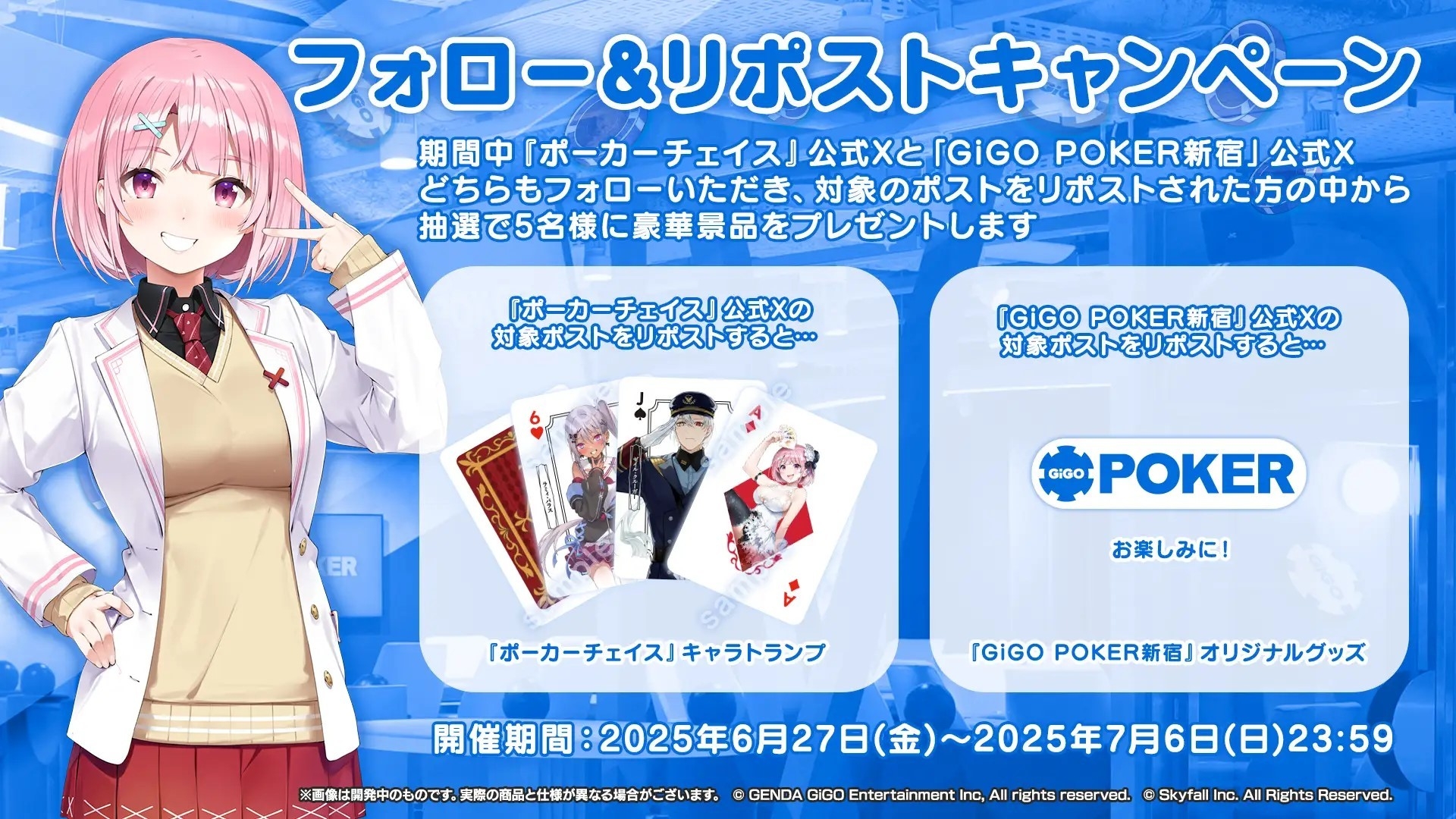 株式会社GENDA GiGO Entertainment(本社:東京都港区、代表取締役社長:二宮 一浩、以下「当社」)は、株式会社Skyfall(本社:東京都港区、代表取締役社長:長谷川 智一、以下「Skyfall」)が運営するバトロワ式オンラインポーカーゲーム「ポーカーチェイス」とのコラボレーションイベントを、GiGO POKER新宿で2025年7月1日(火)~8月31日(日)の期間で開催いたします。
