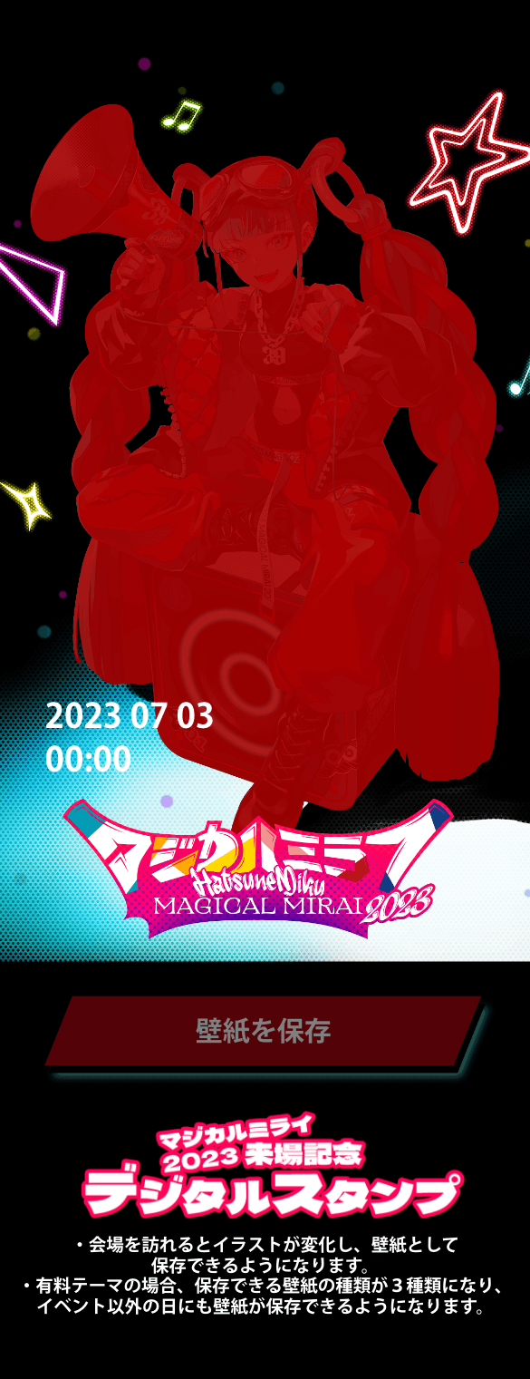 会場付近にいる状態で、来場記念デジタルスタンプ画面を開くと、シルエットがイラストに変化し、画像として保存できます。