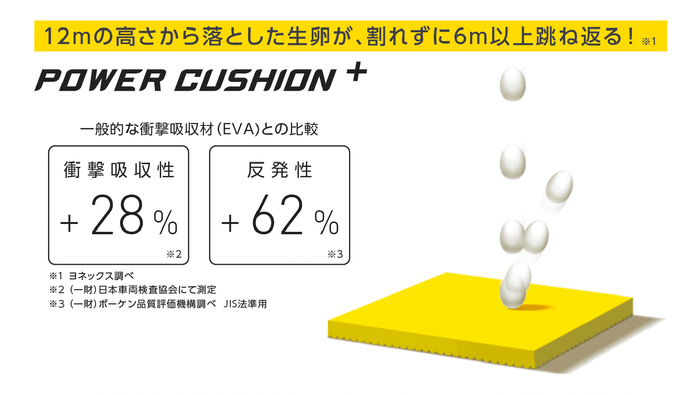 衝撃吸収性と反発性を併せ持つ「軽く、疲れにくい」衝撃吸収反発素材パワークッション。パワークッションに反発性の高い特殊樹脂を添加し、+型の溝を最適な間隔と深さで格子状に配置した新構造を採用した「パワークッション®️プラス」は、従来の軽量性を保ちつつ、衝撃吸収性を28%※2、反発性を62%※3アップさせ(一般的な衝撃吸収材[EVA]との比較)、12mの高さから落とした生卵が、割れずに6m以上跳ね返る衝撃吸収反発素材です。