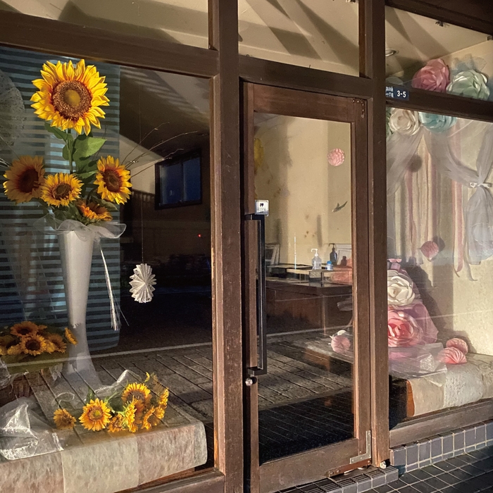 与えられた空間の全部をコントロールし、調和のとれた良い空間表現になっている。白い紙で作られた富士山も目を引き、テグスにつるされたビーズや和紙の手の形が空間のアクセントになっている。