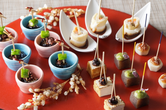 【味噌田楽5種】こんにゃく・木の芽みそ/厚揚げ・クルミ味噌/茄子・肉みそ味噌/信太巻き/里芋・黄柚子味噌