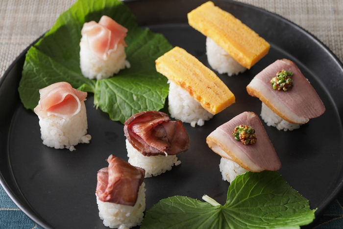 【WAKUWAKUタイム】冷たいそば 鯛と青海苔の天麩羅/肉寿司3種(生ハム・ローストビーフ・鴨肉)麦飯と守口漬けのアクセント/玉子寿司/特製あら汁