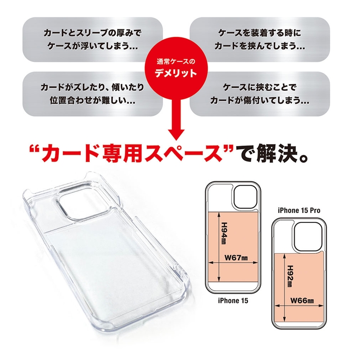スペースのないスマホケースにカードを挟んで持ち運ぶと、内部でカードが動き、折れやキズつきの原因となります。