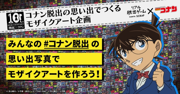 株式会社SCRAP(本社:東京都渋谷区 代表:加藤隆生)は、大人気テレビアニメ「名探偵コナン」とコラボレーションした「リアル脱出ゲーム×名探偵コナン」シリーズ10周年を記念して、「コナン脱出の思い出で作るモザイクアート企画」を開催いたします。