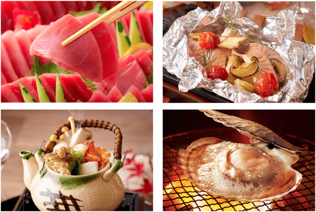 宮城で水揚げされる生まぐろのお造りや、脂の乗ったサーモンときのこの旨味をホイルの中にぎゅっと閉じ込めた「サーモンの包み焼きイタリアン仕立て」などの海鮮メニューや、具材と共に素材の旨味たっぷりの出汁そのものを楽しむ「白身魚ときのこたっぷり土瓶仕立て」をご用意しました。