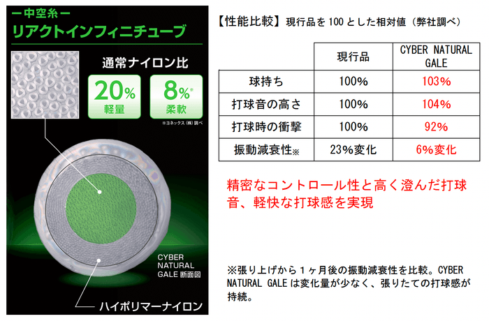 CYBER NATURAL GALEは、芯糸に中空構造の「リアクトインフィニチューブ」を採用したマルチフィラメントストリングで、高いホールド感と軽快な打球感を両立するとともに、高い打球音を生み出します。またカラーバリエーションもVOLTRAGE5シリーズとリンクし、セットでご使用いただけます。