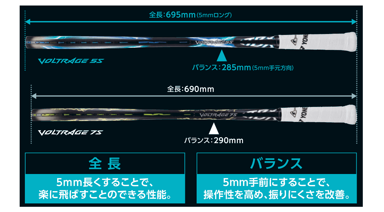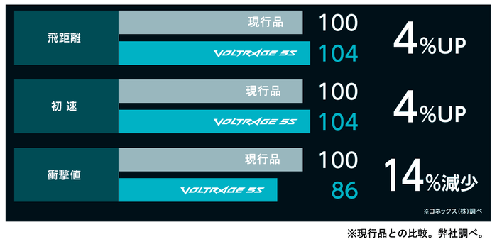 VOLTRAGE 5の独自テクノロジーとして、従来搭載されているグリップ部に加えて、打球時の衝撃が大きいカブト部に新振動吸収素材「Vibration Dampening Mesh(VDM)」を採用し、マイルドですっきりした打球感を実現。また、VOLTRAGE 5Sは全長を長くバランスポイントを手元方向とした新設計により、楽に飛ばせる性能と操作性を両立させました。