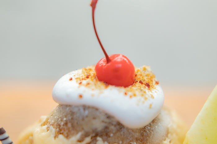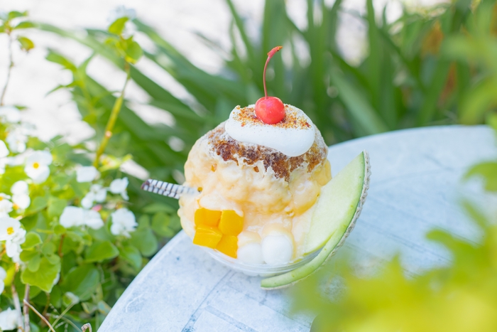 高知県南国市の西島園芸団地さんの甘くて濃厚なメロンや、トロ~リ贅沢なマンゴー、白玉、チョコスティックを豪華にトッピングしています。