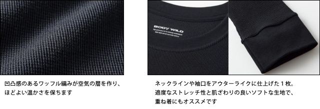 グンゼ株式会社(本社:大阪市北区、社長:佐口 敏康)は、メンズブランド「BODY WILD(ボディワイルド)」 から、秋冬のコーディネートにオススメのロングスリーブTシャツの新商品を10月より発売しました。オフィススタイルのカジュアル化やリモートワークが進み、Tシャツにジャケットというスタイルが定着、オン・オフ問わずTシャツの着用シーンが広がっています。2021年春夏に発売した「BODY WILD」のアウターTシャツグループでも、ジャケットの襟汚れを軽減するためにTシャツの後ろ襟を高くしたジャケット専用設計Tシャツ「ドレスT」など、アウターやシーンに合わせたTシャツ選びをお客さまに提案してきました。2021年秋冬の「BODY WILD」は、新たにストレッチワッフル素材、ジャケット専用設計「ドレスT」、アクリル混素材の3タイプのロングスリーブTシャツをラインアップしました。快適な素材と細部のデザインにもこだわった1枚で着てもさまになり、重ね着にもおススメの「BODY WILD」ロングスリーブTシャツが秋冬のTシャツスタイルの幅を広げます。