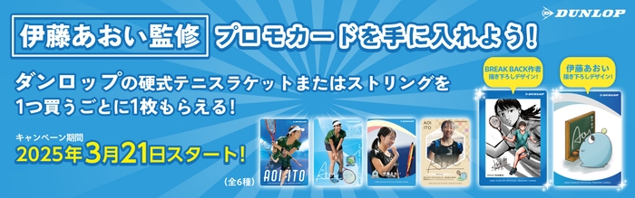 キャンペーン期間中に対象のダンロップ硬式テニスラケット、もしくはダンロップ硬式テニスストリングをご購入いただいた方にプロモーションカードをランダムで1枚プレゼントします。プロモーションカードのデザインは、全部で6種類となっており、キャンペーン特別デザインとして、「月刊少年チャンピオン」(秋田書店)で連載中のBREAK BACK(ブレークバック)作者KASA氏による描き下ろしデザイン1種、伊藤あおい選手描き下ろしキャラクターデザイン1種、その他伊藤あおい選手写真デザインが4種です。このキャンペーンでしか手に入らない貴重なカードです。ぜひこの機会にダンロップ製品をお買い求めください。