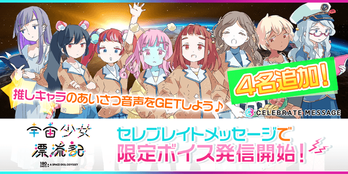株式会社クレイオ(所在地:東京都港区、代表取締役:神名秀紀、以下 当社)は、有名人からのパーソナル動画メッセージ提供サービス『セレブレイトメッセージ』にて、初の定型音声ダウンロード販売として、連続ボイスストーリー『宇宙少女漂流記 』より、追加4キャラクターの音声セット販売を開始しましたのでお知らせ致します。