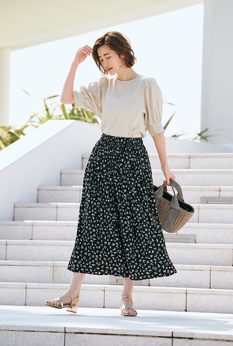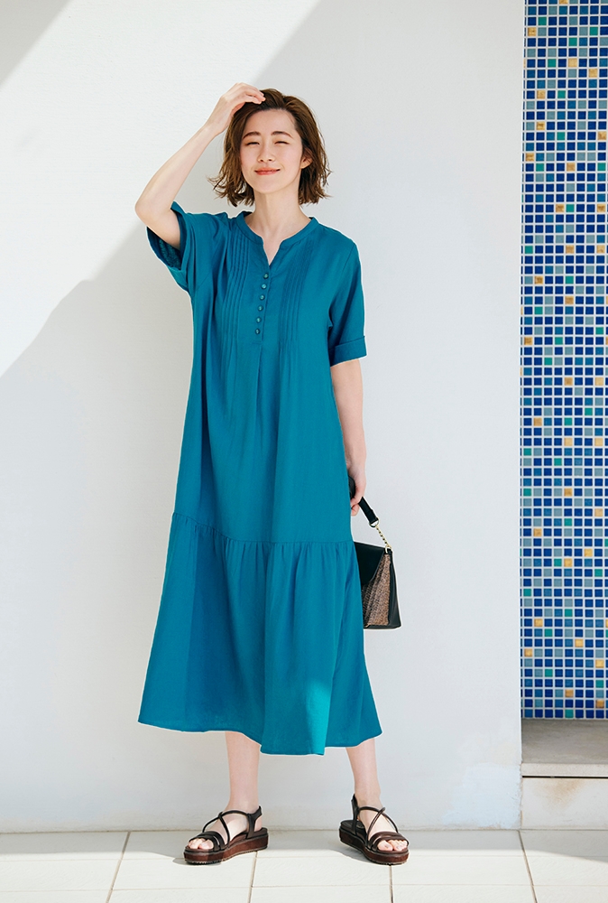 ピンタックや裾のティアードがポイントのフェミニンワンピースは、二の腕カバーができる半袖仕様になっています。