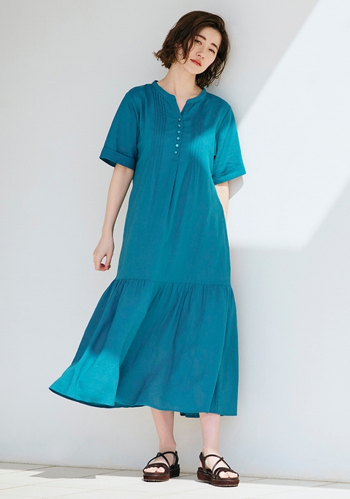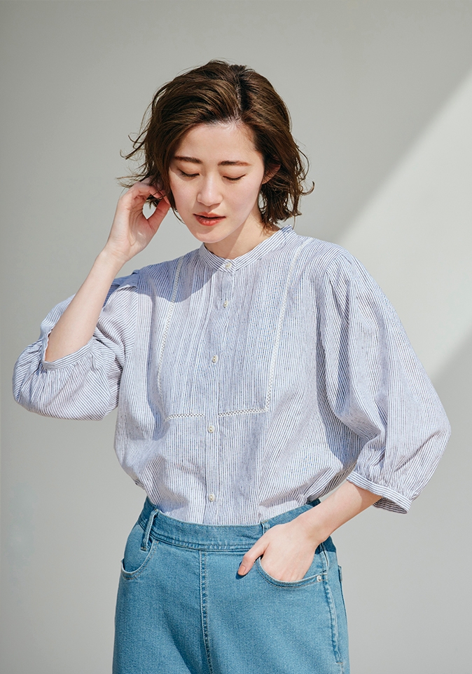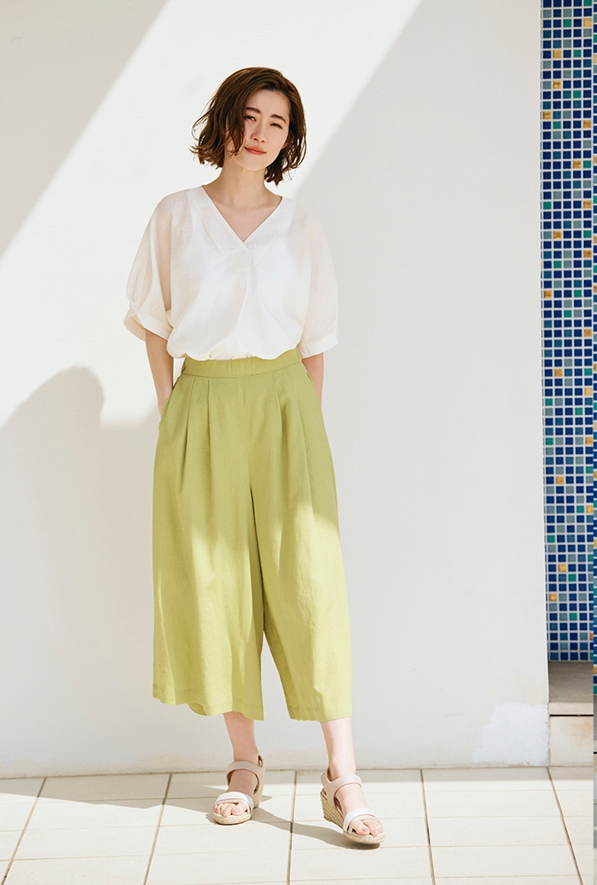 様々なボトムスにコーディネートしやすいブラウスやイージーに穿けてスカート見えするパンツ、程よい抜け感で顔周りの印象がスッキリ見えるワンピースなど、麻の特性である発色性の良さを活かしたカラー展開の商品をラインナップしております。