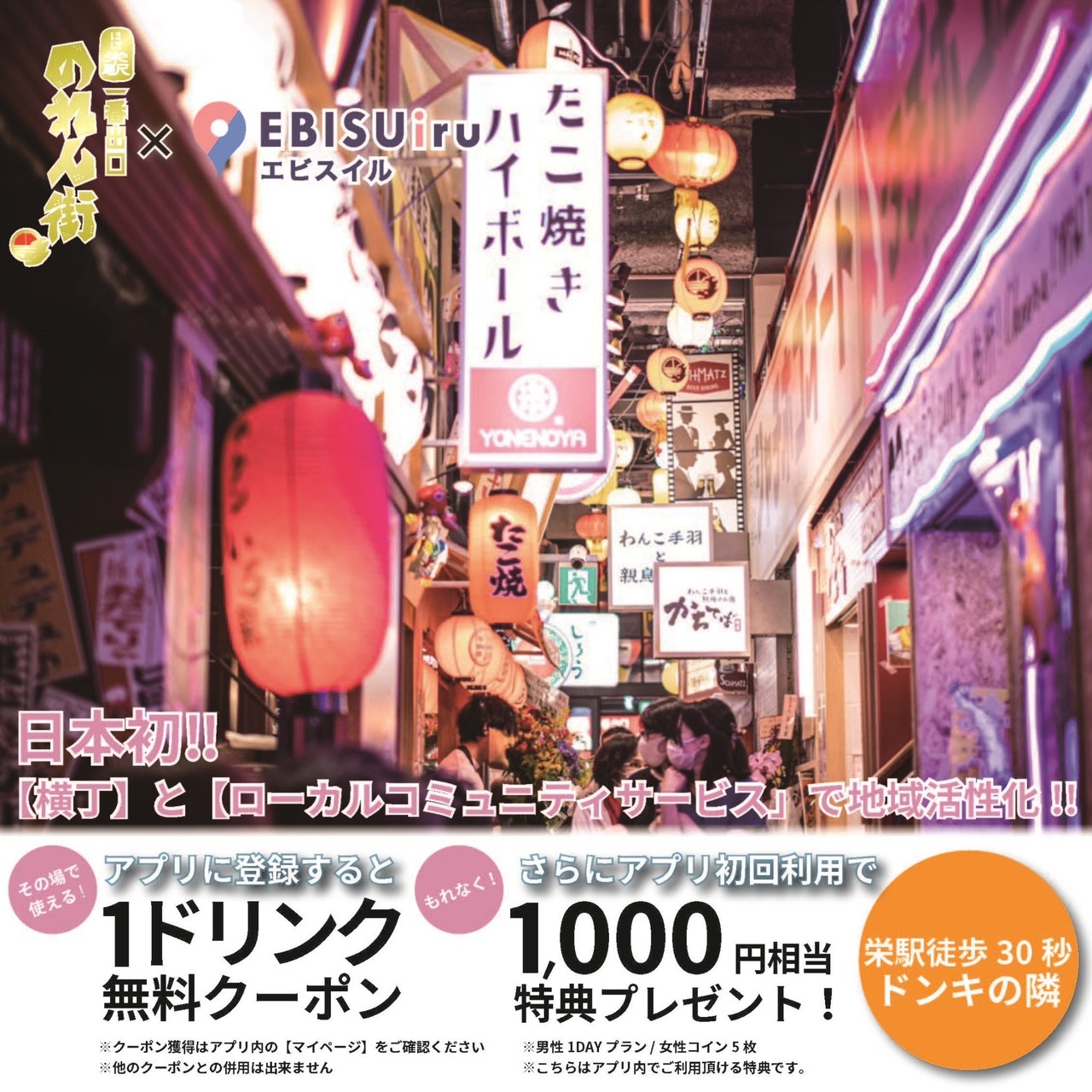 日本初‼️【ほぼ栄駅一番出口のれん街】と【ローカルコミュニティサービス】で地域活性化!ご登録でドリンク無料クーポンがもらえる