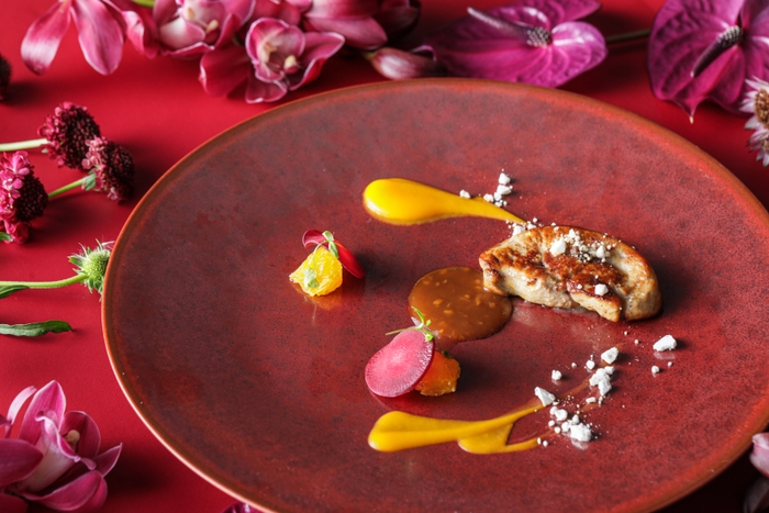 「素材の旨味を最大限活かしつつ、想像を超えた食材・ソースの斬新な組み合わせに、驚きを感じていただきたい。」というシェフの想いを、“食材の宝庫”石川県の旬の幸を使用し表現。“加賀野菜”や“加賀棒茶”、“寒ブリ”などの石川県で獲れた食材と、“冬蕪”や“碧南人参”、“紅ほっぺ”などの地元愛知県の旬食材を掛け合わせました。特別な日に訪れたいレストランとして、ご夫婦や大切な方とのお祝いの席など、特別なシーンでお楽しみいただけます。