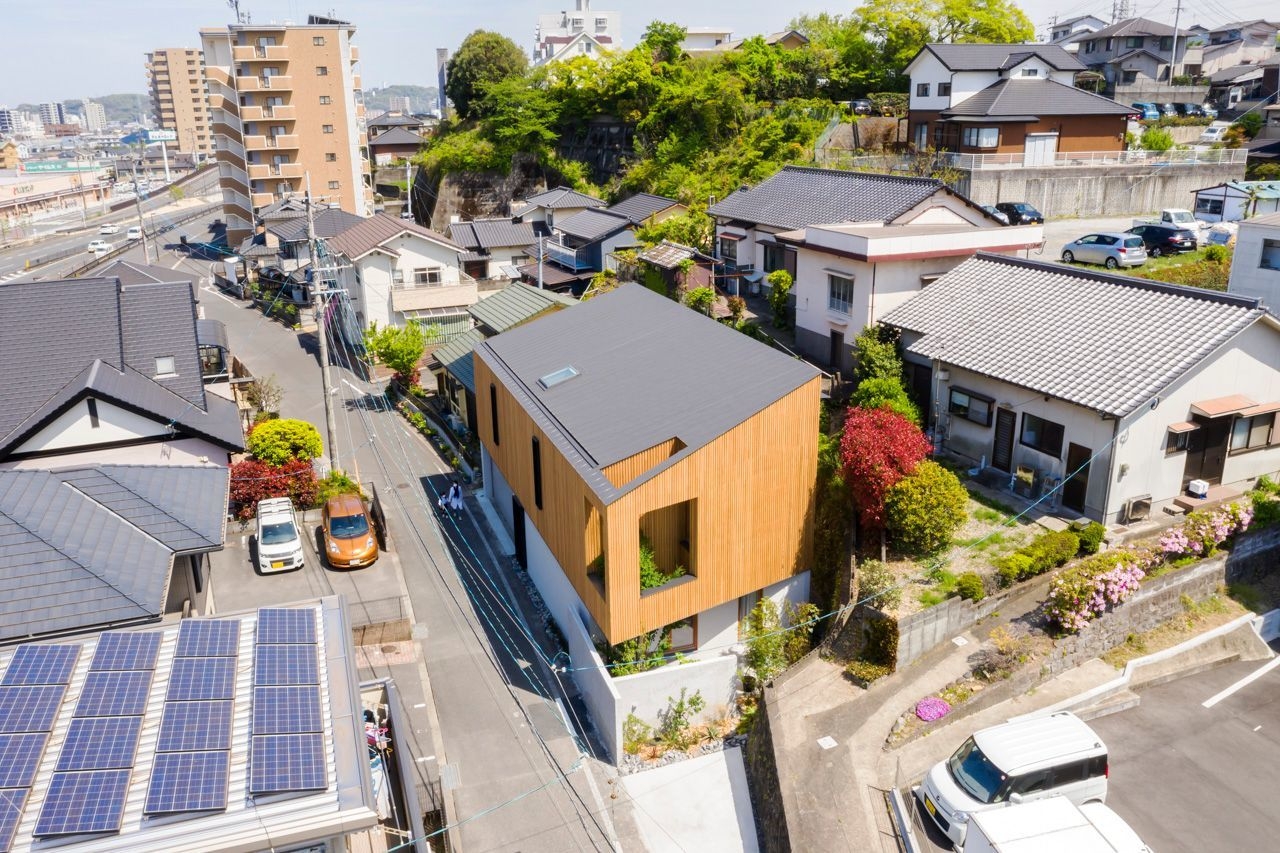本敷地は、大分市内中心部の古い住宅密集地に位置してあり、近隣の住民は皆カーテンを締め切った生活をしています。南側斜面住宅の立ち並ぶ、自然エネルギー利用がほぼ望めないこの敷地条件下で、クライアントは開放的でプライベートな空間を望まれました。