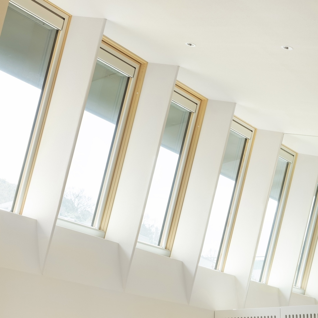 連続するトップライト。建物中心に耐力壁を設け、それ以外の部分を開口部として、屋根勾配に垂直となる様開閉式のトップライトを連装させています。内部のブラインドで証明調整をする仕組み。水回りや寝室との仕切りは家具工事とし、部屋として独立させながら上部のトップライトが連続し開放的な空間としてデザインしました。