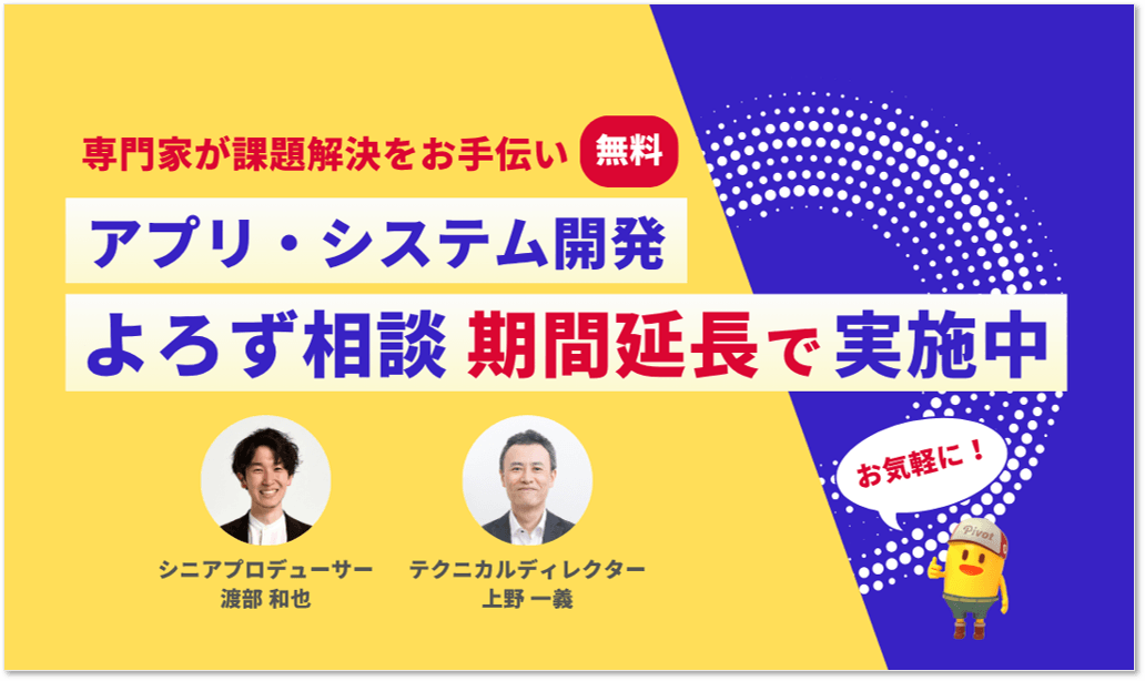 私たちPIVOT( https://pivot.jp/ )はデジタルプロダクトにおける「ユーザーの最高体験」を追及、WEB、アプリ、システム開発のUXデザイン、UI改善、企画から実装、運用に至るまでワンストップでサポートさせていただいております。これからも多くの皆さまに寄り添うビジネスパートナーとして伴走いたします。