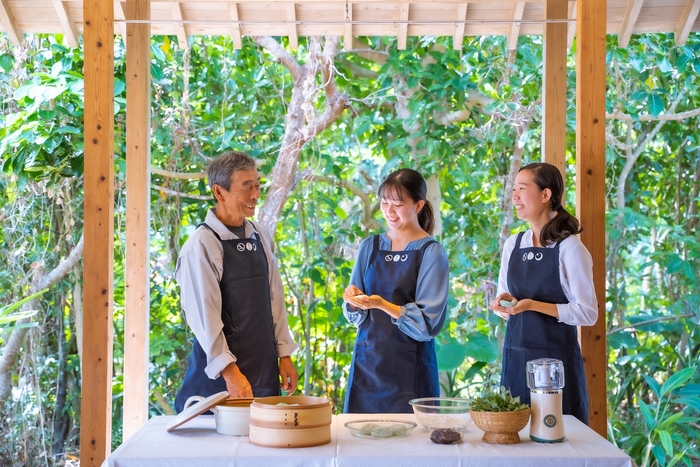 島民と一緒にフーチムチを作ります。フーチムチを作るだけでなく、島民と楽しく交流して竹富島の歴史文化を深く知ることができる体験です。島でフーチバーと呼ばれるヨモギは、春に芽吹き旬を迎えます。星のや竹富島の畑でフーチバーの収穫体験をしたのち、竹富島の昔からの作り方で郷土料理を手づくりします。