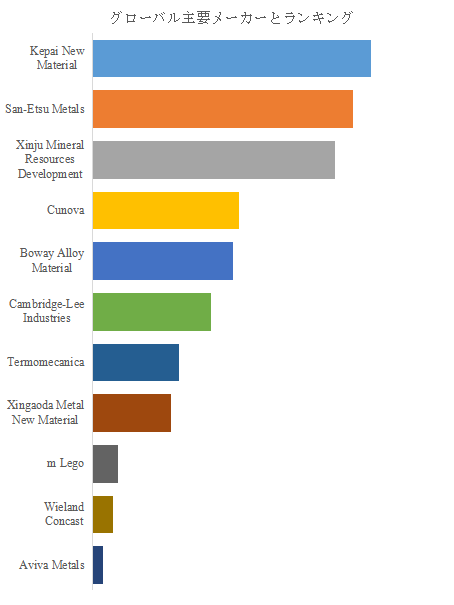 LP Informationのトップ企業研究センターによれば、テルル銅合金市場はKepai New Material、San-Etsu Metals、Xinju Mineral Resources Development、Cunova、Boway Alloy Material、Cambridge-Lee Industries、Xingaoda Metal New Material、Termomecanica、m Lego、Wieland Concastといった企業によって牽引されている。2024年にはトップ5企業が約60.0%、トップ10企業が約77.0%の売上シェアを占めており、市場は高度に集約した構造を形成している。これら主要企業は、導電性・加工性・耐食性を高水準で両立させる合金設計技術を強みに、精密端子、コネクタ、高電流部品、再エネ機器向けなど成長分野で存在感を拡大している。また、各社は原料調達から溶解・鋳造・加工までの一貫体制を強化し、信頼性と安定供給力を武器に国際市場での競争優位を確立している。