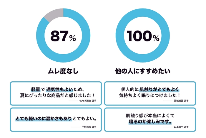 佐々木達也選手は「軽量で通気性もよいため、夏にぴったりな商品だと感じました!」と評価。玉城峻吾選手は「個人的に肌触りがとても良く気持ちよく眠りにつけました!」と睡眠の質の向上を実感しています。