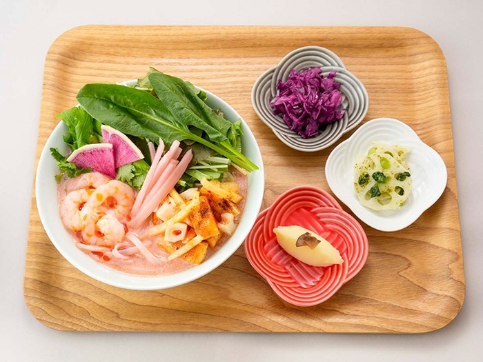 タニタカフェオリジナルの野菜に合う和だしをベースに、トマトソース、豆乳、ココナッツミルクを合わせ、アクセントに岩下の新生姜パウダーとナンプラーを効かせたアジアン風のスープに仕立て、ビーツピューレで岩下の新生姜をイメージしたピンクの色味を演出しました。