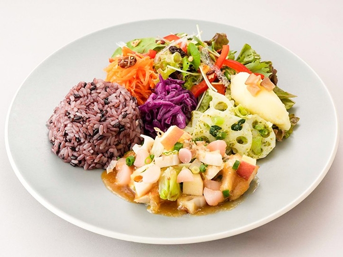 タニタカフェのワンプレートは、厚生労働省が示す野菜摂取目標量の約半分を使用。多彩な味付けで調理された様々な野菜をお楽しみいただけるデリプレートで提供いたします。