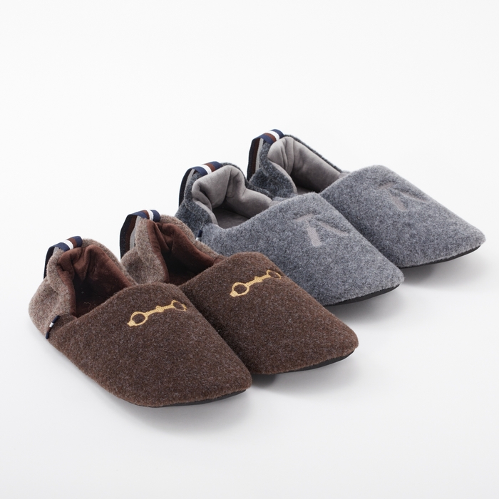 トラッドシューズではお馴染みのデザイン「ビット(馬のハミ金具)」や「タッセル(革の房飾り)」をモチーフに、エンブロイダリー(刺繍)で表現した、柔らかなボア素材のルームシューズ。左右のある作りで、履きよさとリラックスした暖かな履き心地を実現しました。ブランドのアイコンでもあるアクセントリボンが洗練されたイメージで、カタチは靴に近いシルエットのバブーシュタイプ。かかとを踏んでも立てても履いて頂ける2WAY仕様です。