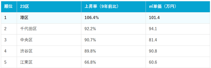 3.東京23区の中で港区が最も高い価格上昇率(+106.4%)を記録し、トップの結果に