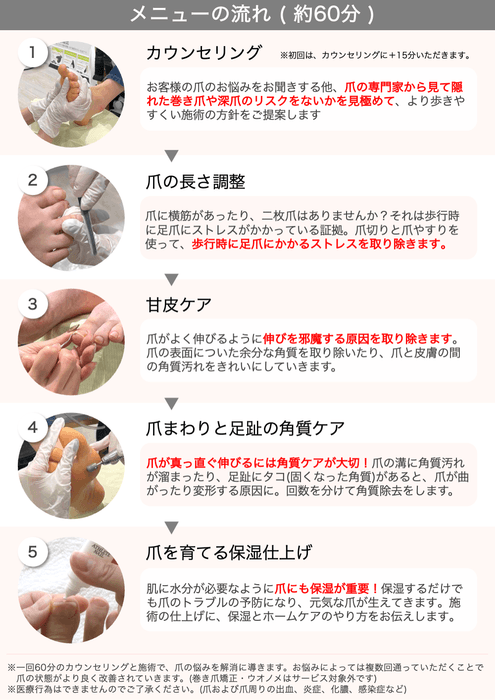 ※お客様の爪の状態によっては、施術ができない場合があります(爪および爪周りの出血、炎症、化膿、感染(白癬、緑膿菌)、肥厚など)