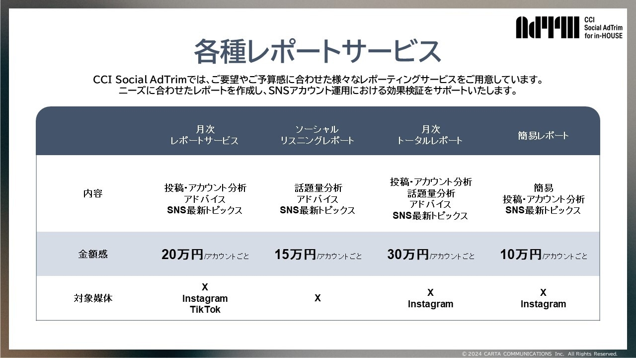株式会社CARTA HOLDINGSのグループ会社である株式会社CARTA COMMUNICATIONS (東京都港区、代表取締役社長:目黒 拓、以下「CCI」)は、企業におけるSNSマーケティングの課題解決を提供するコンサルティングサービス「CCI Social AdTrim」において、SNSアカウント運用のインハウス支援サービス「Social AdTrim for in-HOUSE」の提供を開始いたしました。