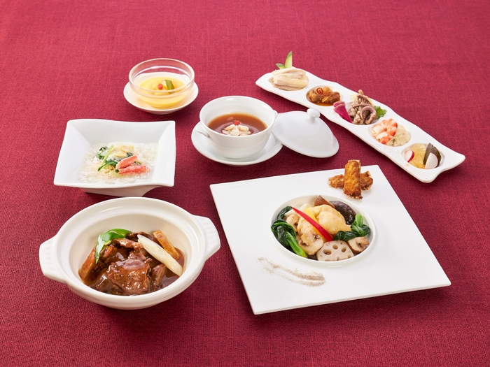 鱈の白子入りふかひれスープや真ふぐと菊菜の紹興酒炒めなど、旬の素材を贅沢に楽しむ特別なディナーコース。6,000円(税込)