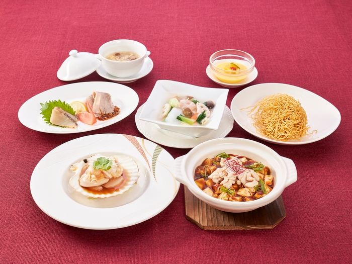 ホタテ貝の広東蒸し、鱈の白子入り麻婆豆腐など、バラエティ豊かな冬の味覚を堪能できるランチコース。3,200円(税込)
