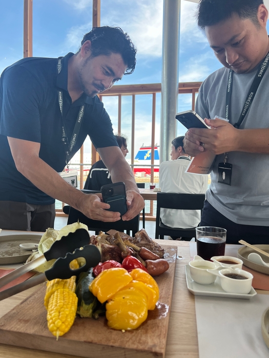 店舗スタッフは調理やオペレーションの確認を行い、来場者は大きなBBQグリルで焼き上げられる海鮮や野菜、三田ポークの塊肉をスマートフォンで熱心に撮影するなど、和やかな雰囲気の中で料理を味わいました。