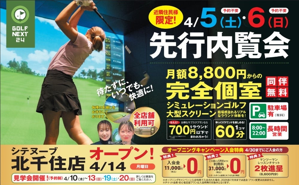 GOLF NEXT 24を展開するワイムシェアリング株式会社(本社:東京都新宿区、代表取締役:佐藤 直史)は、4月に東京・神奈川に新店舗「GOLF NEXT 24藤沢善行店」「GOLF NEXT 24シテヌーブ北千住店」をオープンします。新店舗は、広々とした全室個室による快適な空間でお客様をお迎えいたします。詳細は公式サイト(https://golfnext24.jp/)でご覧いただけます。