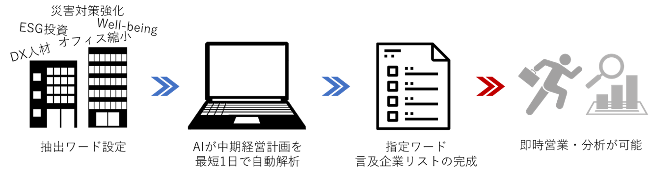 中期経営計画を毎日クローリングしデータを蓄積しているので、最新の企業ニーズの把握が可能です。