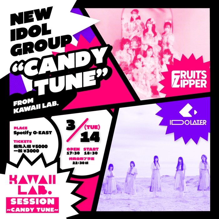 また、CANDY TUNEのデビューライブとなる「KAWAII LAB. SESSION CANDY TUNE」が3月14日(火)Spotify O-EASTにて開催決定! ライブにはKAWAII LAB.に所属するIDOLATER、FRUITS ZIPPERの出演も決定しており、CANDY TUNEは先輩グループと同じステージで初パフォーマンスを披露する。