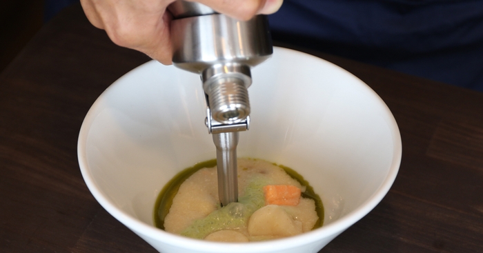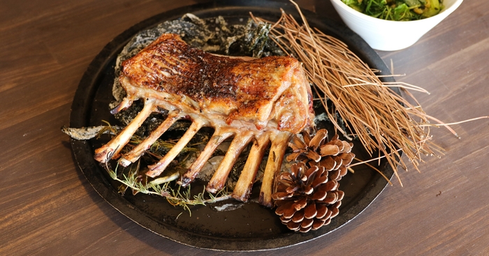 松葉で香りを付けたラム肉に、海をテーマにした海藻とハーブを合わせたオリジナルソースで潮風を浴びて育った子羊をイメージしたお料理に仕上げました。