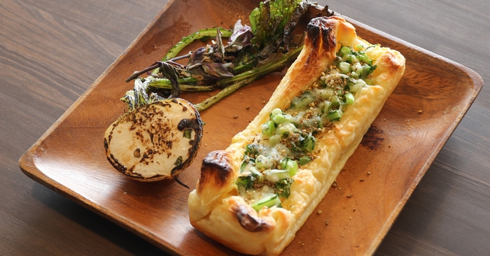 地元の野菜だけでキッシュを作りたかったので葉っぱから根まで全て使える野菜を使いました。こだわりのパイ生地をたくさん食べてほしい気持ちからあえてスティック状にしています。