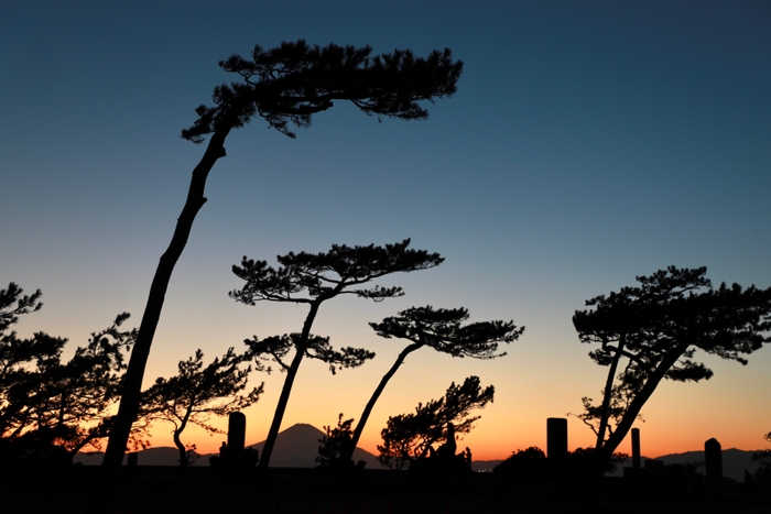 松林越しに見る富士山の夕景。黒松と海越しの富士山が幻想的な景色を作り出し、夕焼けが見える頃に自然と人が集まる場所です。