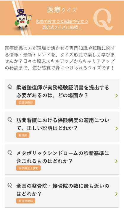 空き時間に気軽に楽しめる4択選択式のクイズで、楽しく医療・転職に関することが学べます!