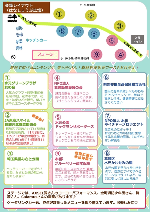 【協力団体】:水元かわせみの里、水元公園 ドッグランサポーターズ、NPO法人葛飾動物愛護の会、水元グリーンプラザ友の会、埼玉県営みさと公園、NPO法人水元ネイチャープロジェクト、明治安田生命保険相互会社、 JA東京スマイル葛飾元気野菜即売会、金町消防少年団、AXSEL翼、舞歌、Calamus(順不同)