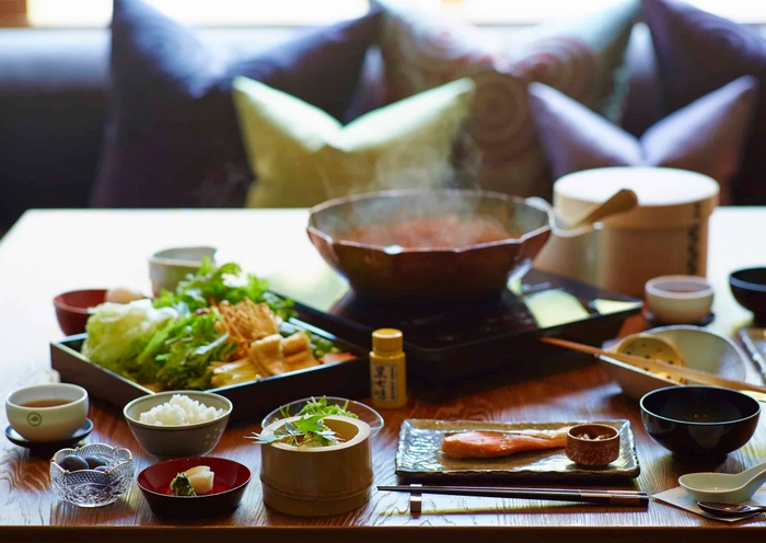 星のや京都の朝食は、季節の野菜をたっぷり使った朝鍋です。料理長特製の旨味の強い出汁で、冬に甘さと栄養が増す白菜やかぶらなどの季節の野菜を食べます。旅で疲れた身体を内側からあたためることで、一日の活力を得られます。