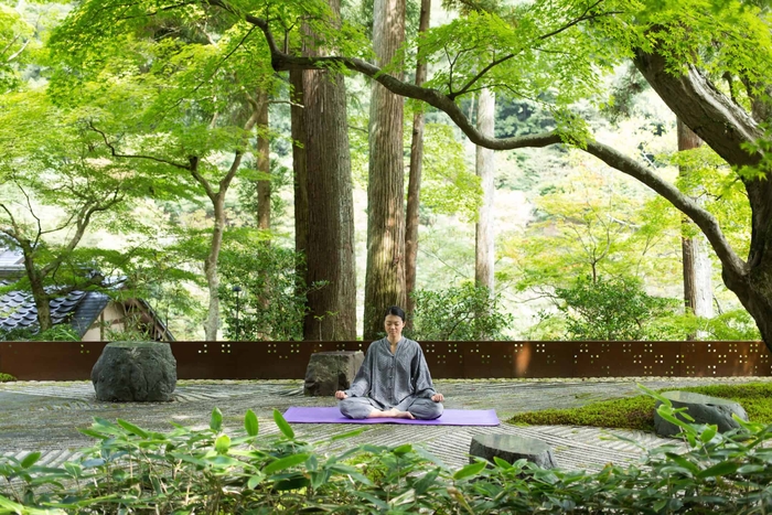 冬の凛とした空気のなか、星のや京都の「奥の庭」で呼吸法を重視したストレッチ「水辺の深呼吸」を行います。奥の庭は、燻(いぶ)し瓦と白石を砂(さ)紋(もん)に見立てた枯山水の風情の庭です。庭からは、星のや京都の目の前を流れる大堰(おおい)川(がわ)の流れや対岸の小倉山の木々を眺めることができます。奥の庭の開放感とともに深呼吸をしながら四肢を伸ばすことで、血が巡り、身体があたたまります。