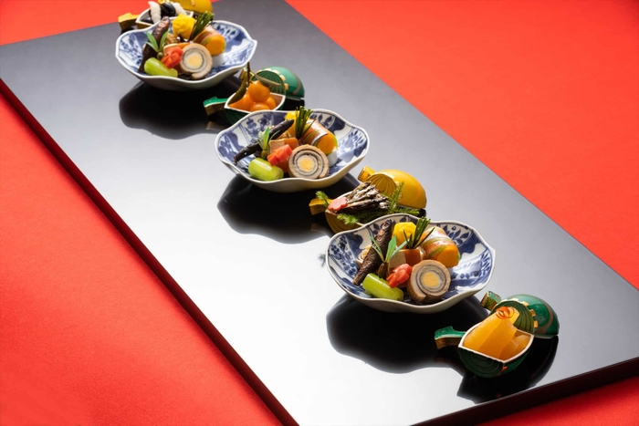星のや京都のダイニングでは、2020年12月1日~2021年1月31日の期間、「冬の暖を味わい、春の芽吹きを待つ」をテーマにした会席料理を提供します。一面が雪に閉ざされしんとした冬の嵐山に滞在するからこそ、冬ならではのあたたかさを五感で味わい、雪が降りしきる一面の銀世界や迎春の寿ぎ、そして春の芽吹きの情景を楽しむことができる料理です。